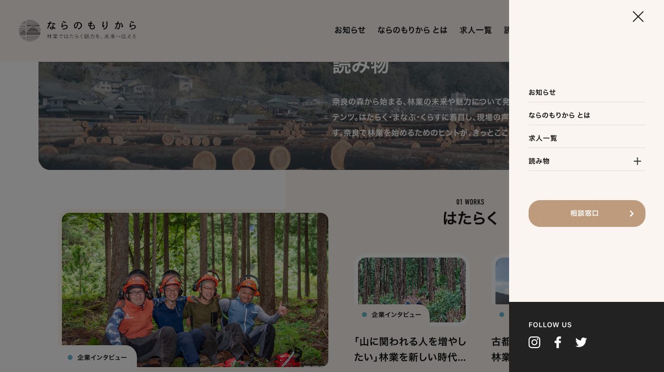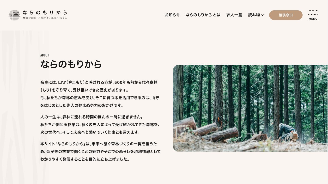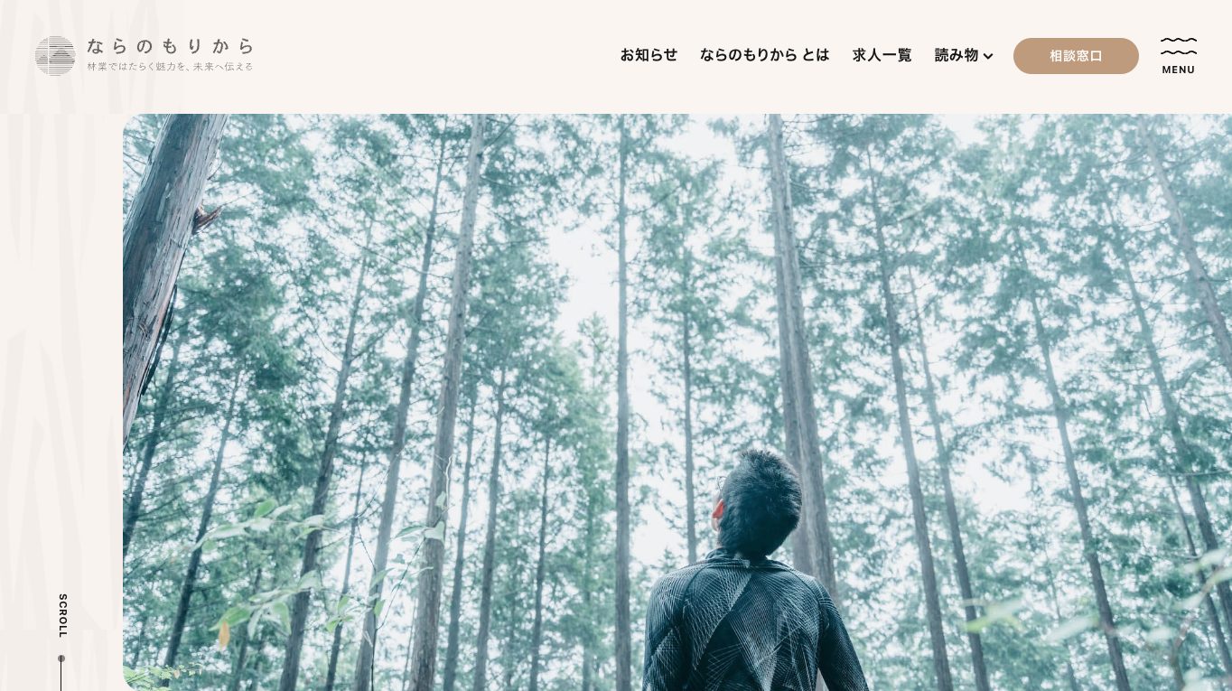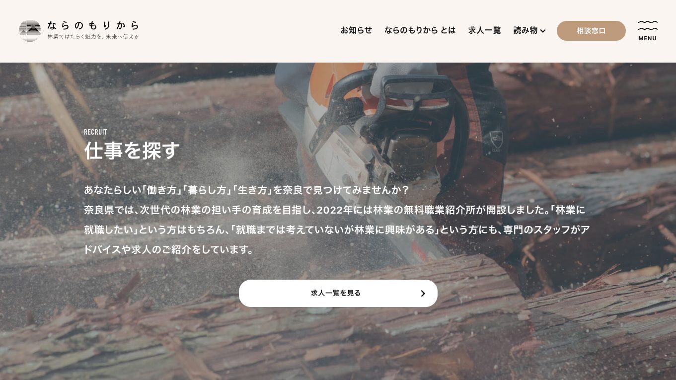 未来へ繋ぐ森林づくりの一翼を担うため、奈良県の林業で働くことの魅力やそこでの暮らしを現地情報としてわかりやすく発信することを目的としたポータルサイトのデザインから実装を担当。「親しみやすさ・やさしさ・あたたかさ」にフォーカスし移住や転職という人生の大きな変化を伴ってこれから林業に携わろうとする方々に対して、不安を解消したり、あたたかく向かい入れるという想いをデザインに落とし込んでいます。